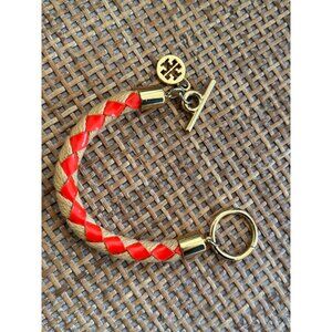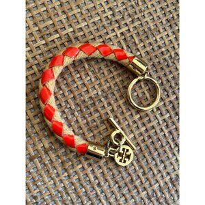 Tory Burch bracelet, woven bracelet, leather jewelry, toggle bracelet, logo charm, women's accessory, fashion bracelet, gold-tone jewelry, designer bracelet, chic bracelet, elegant wristwear, braided bracelet, high-end fashion, Orange and beige, Tennessee orange