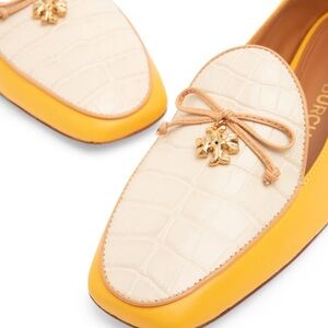 Tory Burch yellow and cream bow loafers with Tory charm details and front bow details.