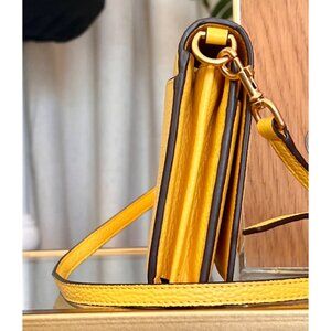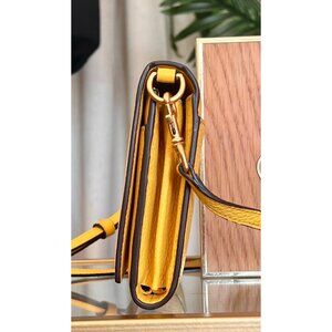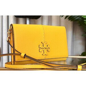 Elevate your style with this vibrant Tory Burch McGraw/Taylor crossbody bag. The bold yellow leather and iconic logo make a striking statement, while the adjustable strap ensures comfort and versatility. Ideal for carrying essentials, this bag combines fashion and function beautifully.