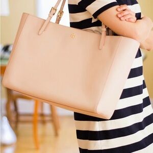 ✨Like New ✨Tory Burch York Tote bag in a light blush color. Made of saffiano leather, with double handles, an open top, and a padded interior laptop compartment. It has a logo jacquard lining and several interior pockets. The bag is designed with a clean and practical space, suitable for daily use. Known for being a versatile work-to-weekend bag, often praised for its durability and spaciousness.