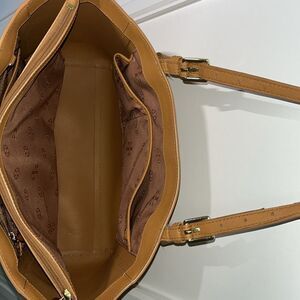 Normal wear inside, some spots on bottom of interior and a couple very small ones on bottom of exterior. Straps have peeling (please see pics)