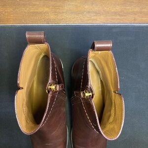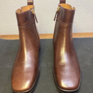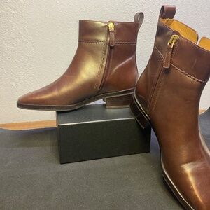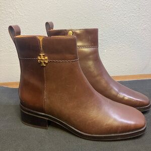 Sierra brown leather ankle boots with short heel. Gold Tory Burch emblems. New with tags minor scuffs.