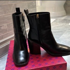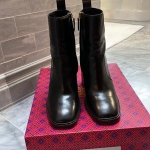 Reposhing this item I purchased from @jadon2015. Loved it, but ended up being too big. Gorgeous Tory Burch Sierra Antik heeled ankle boot. 4 inch stacked leather heel.Side zipper. Perfect black.Normal wear. Smoke free home.