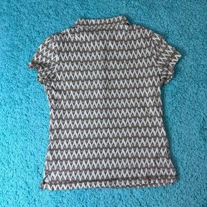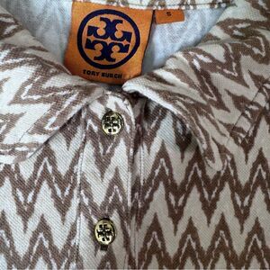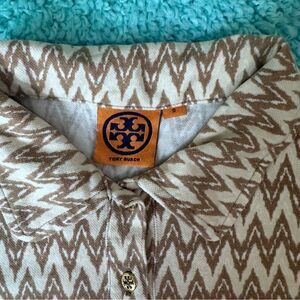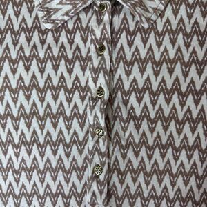 This Tory Burch top showcases a brown and cream geometric pattern, enhancing its modern appeal. The short-sleeved, fitted design with a polo collar offers a stylish and comfortable fit. Ideal for various occasions, this button-down shirt is a chic addition to any wardrobe.