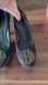 Step into sophistication with these Tory Burch heels, crafted in brown suede with a striking gold medallion accent. The stacked heel, platform, and rounded toe design make them perfect for any occasion, offering both style and elegance.
