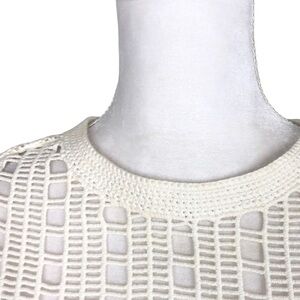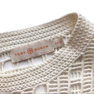 Tory Burch crochet ladder-knit ivory/cream top. Elbow-length sleeves. Fringe detail at cuffs and hem. Perfect for spring! Snap straps at shoulders to keep bra and camisole straps in place. Top is see through and needs a camisole or other piece worn underneath. Excellent used condition: no stains, holes, or pills.