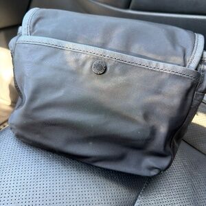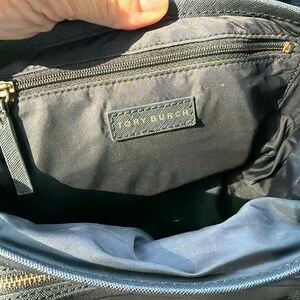 Pre-loved Tory Burch crossbody. Black nylon with brass/gold hardware. Like new. One front zip pocket, one outside back snap pocket, one inside zip pocket, and one inside slip pocket. Measures approx. 9 inches wide by approx. 7 inches tall by approx. 4 inches deep.