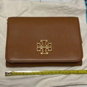 Elegant brown leather Tory Burch crossbody bag, with detachable strap. Can be used as a clutch with gold logo TB detail. Perfect for any occasion.