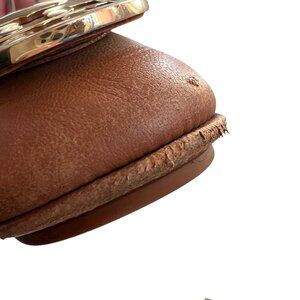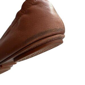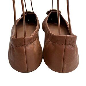 Tory Burch Minnie ballet flats, tan brown, gold metal monogram, rubber soles, foldable / packable, slip on, size 6, preowned and shows wear on the soles and lining, scuffing - see photos