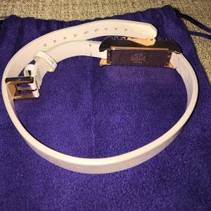 Tory Burch's iconic fretwork patterns this comfortable leather wrap bracelet designed to subtly hold a Fitbit Flex tracker. A secure latch on the inside makes it easy to insert the multitasking tracker (sold separately) and monitor your fitness and sleep patterns in style.