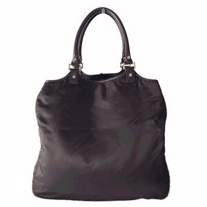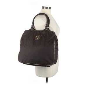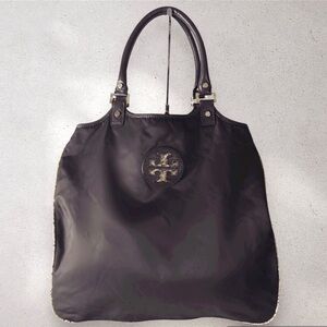 Tory Burch brown nylon tote with leather animal print trim, features leather medallion logo at front double shoulder handles, snap button closure with leather closure strap on top, interior lined with animal print fabric, one zipper pocket and 2 slip pockets, bottom protective studs