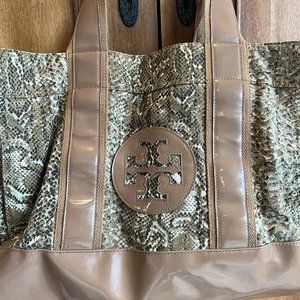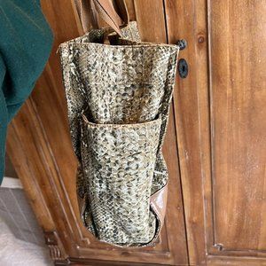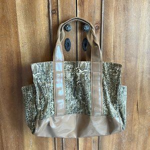 Large canvas tote in snake skin pattern and tan patent detailing. Multiple pockets inside with zipper closures. Some signs of wear including minor interior staining, scuffing on bottom, and fraying of thread on handles.