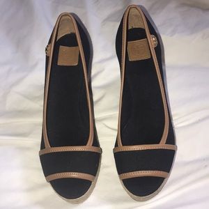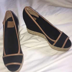 Covered wedge heel, canvas lining, canvas insole, espadrille platform, and rubber outsole