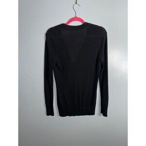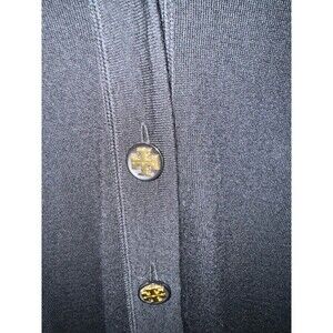 Tory Burch black cardigan. 100% merino wool button closure sweater. The front buttons all have a gold tone Tory Burch logo. There are two flaws. I have photographed the small hole on the front right shoulder and there is a very small hole on the front right body of the sweater. Those can be it be seen if wearing a darker colored top underneath and not noticeable at all if worn open. There are micro ribbed cuffs and hemline. It is a size small. It is a beautiful career wear or workwear sweater. Perfect for casual or dressy occasions.