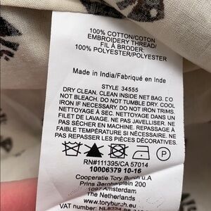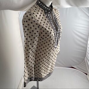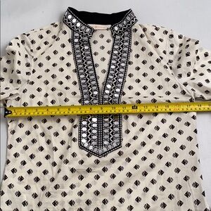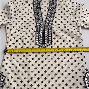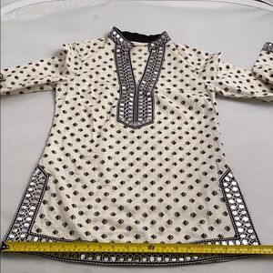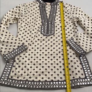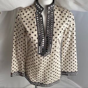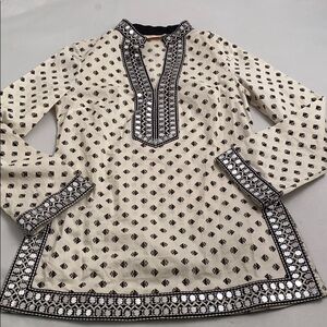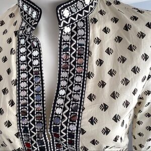 Tory Burch island inspired fish print tunic cream and black. Embroidery and mirrored paillettes along the split neckline, placket and cuffs. Made of lightweight cotton with side slits. Essential classic style is a staple of everyday and getaway dressing. Excellent condition. Smoke free home.