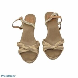 Tory Burch natural Camelia jute wedge sandals. Color-blocked jute builds an arresting cross-strap espadrille finished with smooth, belted leather. Adjustable strap with buckle closure. Espadrille style wedge sandals. Color is called natural. Jute ropes, leather straps.
