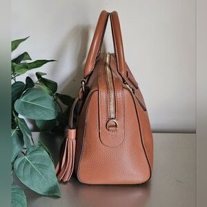 Tory Burch nwt Thea Small Brown Pebbled Leather Web Satchel Crossbody Bag moose come south charm dust bag gold Tone Hardware zipper closure double tassel bag charm, 1 interior slip pocket, 4 protective feet and adjustable strap. Approximately 7 1/2"h x 10"w x 5"d, strap 50" length handle drop 4"