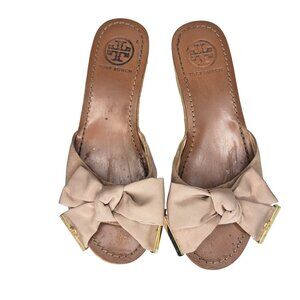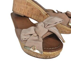 Tory Burch penny Leather Sole cork Wedge Sandals Bow Detail Size 6.5 Light Brown