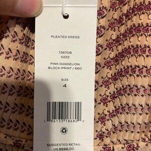 Tory Burch pink dandelion block print pleated dress in a size 4. New with tags. I believe it's a silk-cotton blend but cannot find the garment tag in the dress. Comes with detachable pink shift dress.