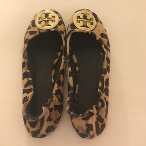 Brown and black pony hair Burch flats with rounded-toe, leopard print throughout, gold-tone logo accent at vamps, contrast stitching and rubber soles.