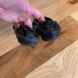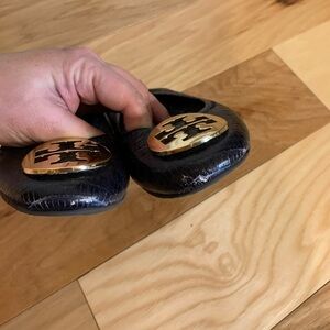 Tory Burch lizard embossed Reva in deep purple. Some minor scuffing on toes, moderate to heavy heel wear. Gold tone medallion. Size 7