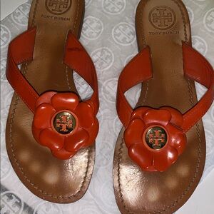 Tory Burch rare breezy Bold orange sandals with floral accents. Iconic Tory Burch emblem on top. Pre loved and in great condition, leather with my toe autograph. Paid about $300 for them. Can’t find them anywhere. Love them but need the money. Have to move. Follow my closet for my bag charms over 100 and bundle for best deals. Thanks