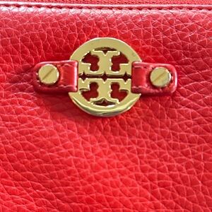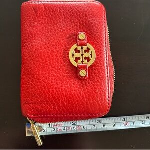 Tory Burch red pebbled leather zip around card coin paper holder with gold hardware key ring. Essential classic style featuring gold tone hardware nailhead detail and logo on exterior. Smoke free home