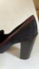 in good condition. There is some signs of a wear on the heel but it is minimal. The bottom has nonslip soles applied. The shoe is a very deep navy color with a burgundy stripe. The hardware is gold. The material of the shoe appears to be suede. The overall shoe is clean and maintains a very beautiful appearance.