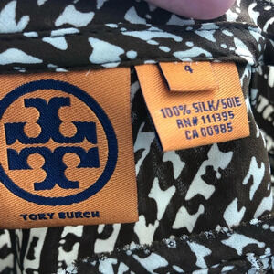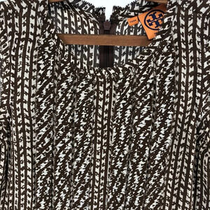 Brown and cream print with ruffles down the front. 100% silk shirt. Zip and eye hook closure in the back. Classy Tory Burch. No flaws