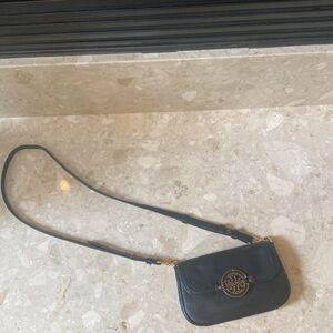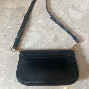Elegant black leather crossbody bag with gold accents. Perfect for any occasion.