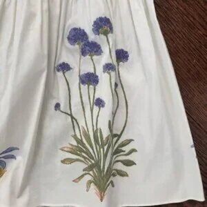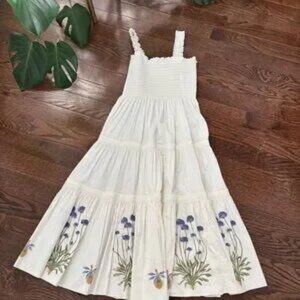 Tory Burch smock dress off white with purple flower design along bottom of dress. Elastic bodice and straps.