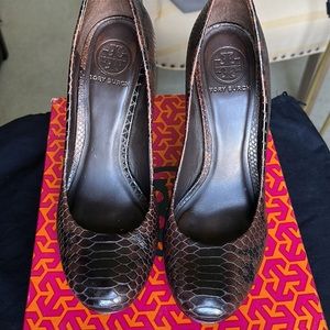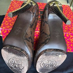 Super cute heels with gold T down back of both heels. Sexy looking when walking. 4” heels with 1/2” platform in front. Box included.