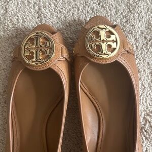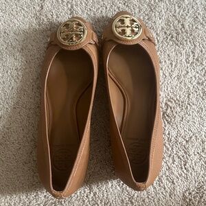 Tory Burch tan leather Amanda peep toe wedge pumps, size 9