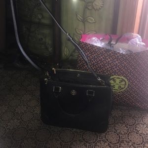 Practically brand new used a handful of times Tory Burch black leather gold zipper comes with a body. Top (opening of the purse) measures 13 inches ,the height is 10 inches , the bottom of the bag is 5.5 inches and the handle drop is 5 inches