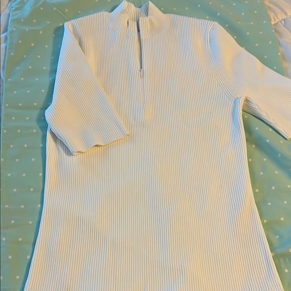 Elegant white ribbed top. Features a half-zip front. Perfect for casual or formal wear. Never been worn but lost the tags and can’t return.