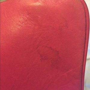 Tory burch pink leather wristlet with gold hardware and studs around heart. It does have some marks on it(see pic) and the wear and marks have been accounted for in the price. Zipper works. 7 3/4 inches long, 5 inches tall. Wristlet strap is removable #toryburch