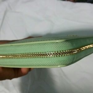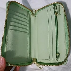 Preloved in very good condition. The wristlet strap is missing and only some minor scuff rust on the zipper. All shown in pictures. Stunning color mint for everyday wear spring and summer. Saffiano leather & very durable. Fits iphone 6 or samsung 6 or note 4. 2 bill slots, 6 cards, 1 zip coin.