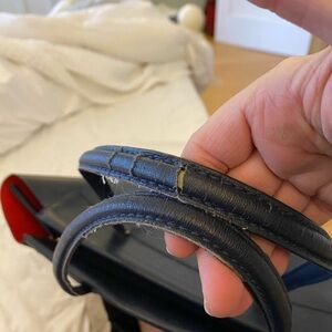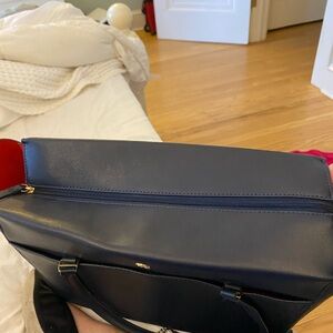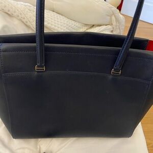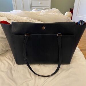 Tory Burch Robinson zip up tote. Navy blue. 19 inches across, 7 inches wide, 11 inches height. Very good condition. A few minor stains on the interior as shown in pictures. Also handle has some damage - shown in pictures and will need small repair. Other wise bag looks great!