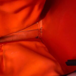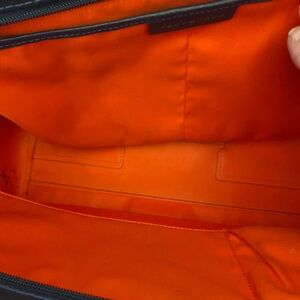 Tory Burch zip up Robinson navy blue tote with orange interior.