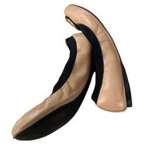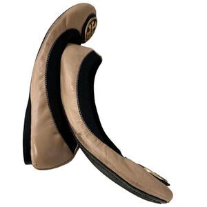 Tan leather flats with black elastic and TB medallion. Number one favorite shoes I have for comfort. 9.5