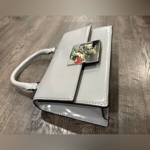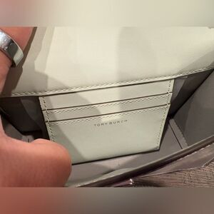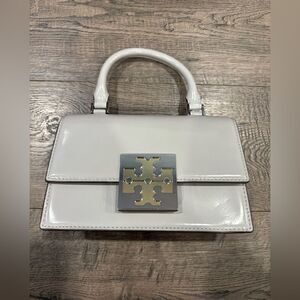 Elegant gray crossbody bag with signature Tory Burch logo. Sleek design with top handle and adjustable strap.
