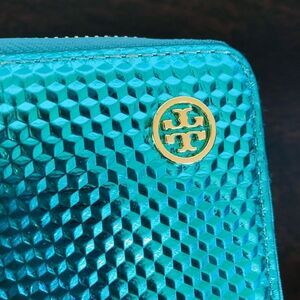 Tory Burch metallic aqua blue textured wristlet wallet in excellent barely used condition with very minor wear. Clean nonsmoking home.