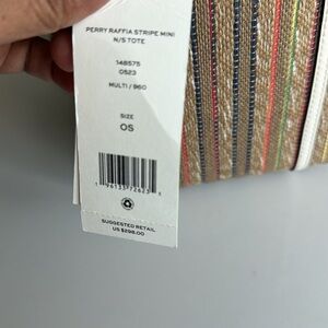 Colorful striped raffia and contrasting trims enrich a scaled-down tote fashioned with a spacious interior and multiple straps for styling versatility.