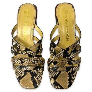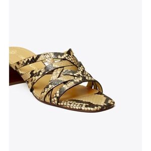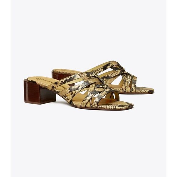 The hand-woven basket-weave on this summery sandal is an interpretation of a classic rattan pattern, based on Tory's love of natural materials. The stamped snake-print leather is a perfect neutral to wear with the season's sun-bleached color palette.
