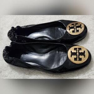 Tory Burch Reva Women's Patent Tumble Leather Ballet Flats Black/Gold US 8.5