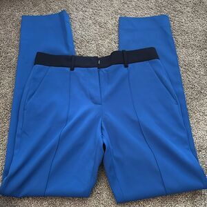 Elegant blue pants with a sleek black waistband and cream detailing. Ideal for a modern look.