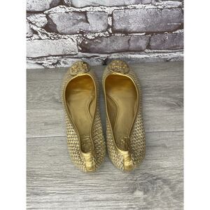 Tory Burch Straw Reva Gold Leather Logo Ballet Flats Women’s Sz 7.5M US/38EU