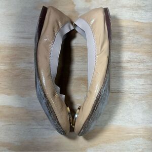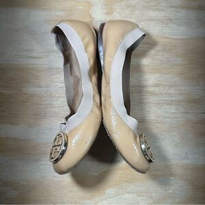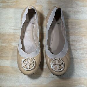 Experience timeless elegance with these Tory Burch flats, crafted in a sophisticated tan leather. The signature TB medallion adds a touch of luxury, while the elasticized opening ensures a comfortable fit. Perfect for versatile styling, these flats are a must-have addition to any wardrobe.