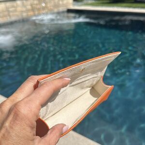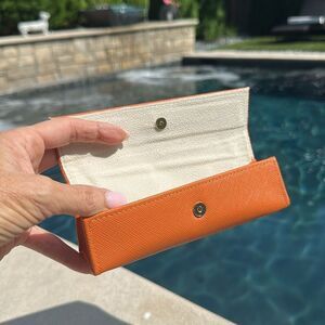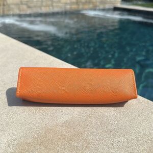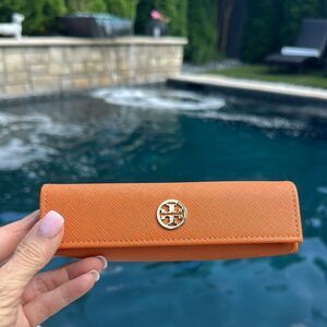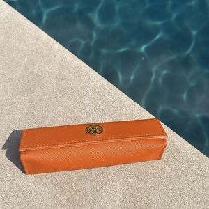 Tory Burch Eyewear Sunglasses Case designed to protect sunglasses from scratches and damage. The case is orange with a gold Tory Burch logo on the front and has a magnetic snap closure. It is a hard case that provides excellent protection for glasses or perfect to store lip liners, eyeliners and other makeup sticks. Clean non smoking. This case is approximately 6 1/2 inches long and stands approximately 1.75 inches tall.