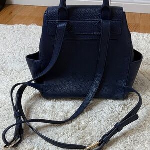 Amazing condition! This stylish navy blue leather backpack is perfect for any occasion. Its sleek design and high-quality material make it a must-have accessory.